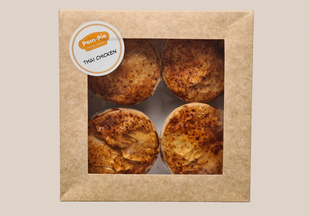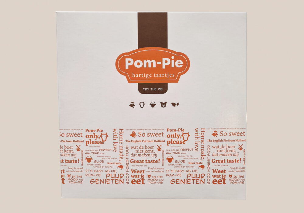 Verpakkingen Tansparant zakje Consumenten verpakking Voor Pies – 150 of 225 gram Voor Quiches – 180 gram Kartonnen doosje met venster Voor 4 Pies – 150 gram Kartonnen doosje met venster Voor 9 Pies – 50 gram Kartonnen doosje met venster Voor 1 Quiche Groot – 900 gram Kartonnen doosje met venster Kleine maat 4 pies – 50 gram Kartonnen doosje zonder venster Voor 1 Familie Pie Groot – 900 gram Bulk verpakking Voor 30 Pies – 225 gram Voor 40 Pies – 150 gram